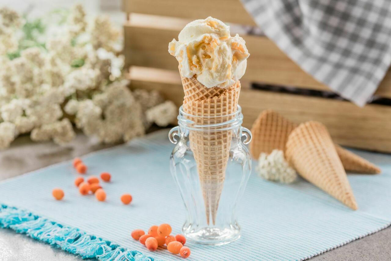 Meie lambapiimajogurtist valmistatud gelato kodumaise astelpajuga.